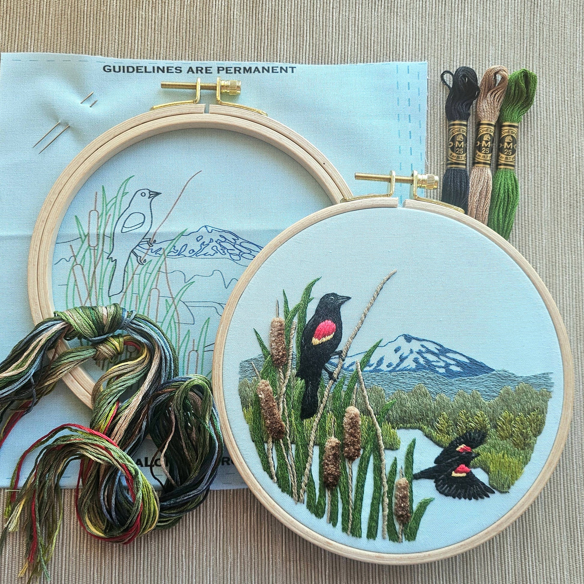This challenging embroidery project combines thread painting and stump work to create this soothing landscape featuring red-winged blackbirds. The design is inspired by the view of Mount Bachelor and the Deschutes River as seen from Sunriver in Central Oregon. The printed instructions and online video tutorial will be your guide as you pad the blackbird, create the 3D cattails and fill the space with realistic trees and plants.
