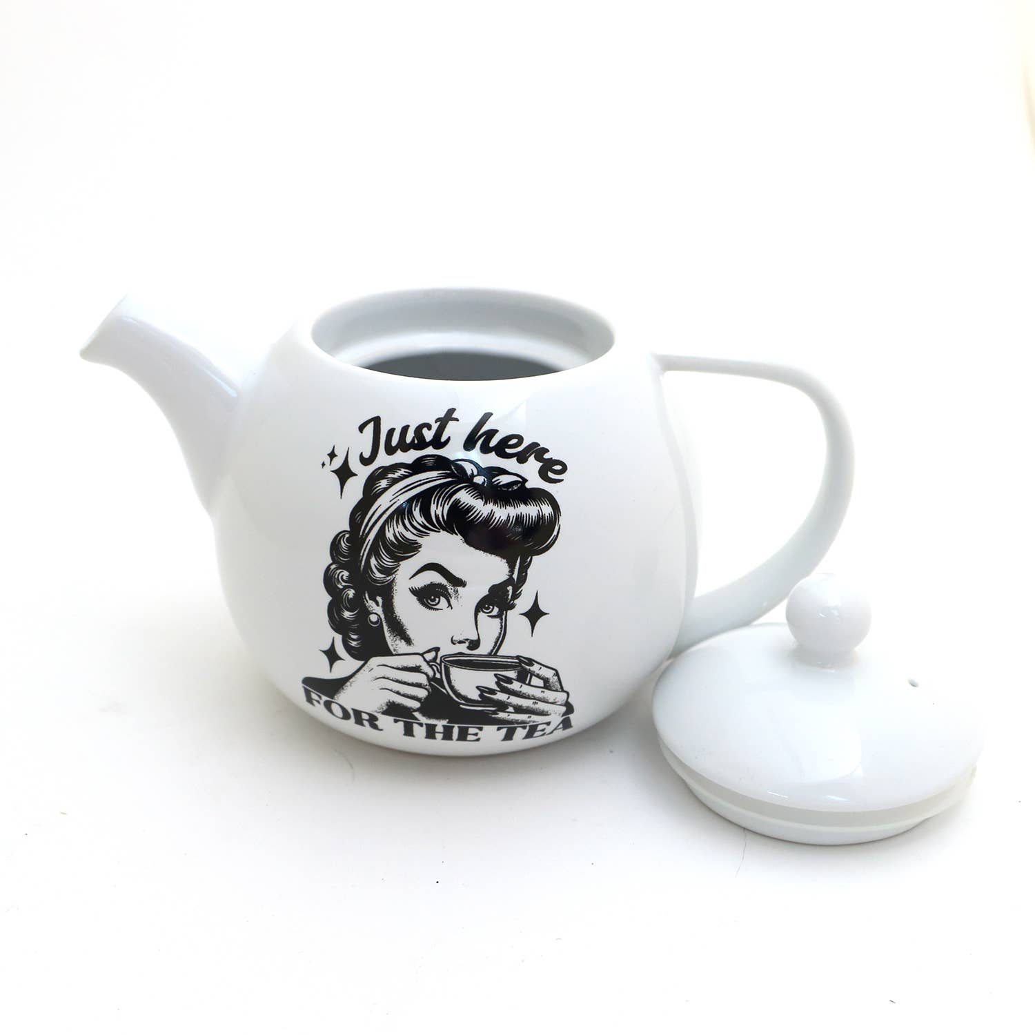 Just Here for The Tea...Just Spill It, Small Round Teapot. Funny gift for a tea (and gossip) lover. The teapot holds 22 oz. and measures 8" x 5" and is 5 1/2" high. Created from stoneware clay and lead free glazes, kiln fired. Safe to place in the dishwasher and microwave.