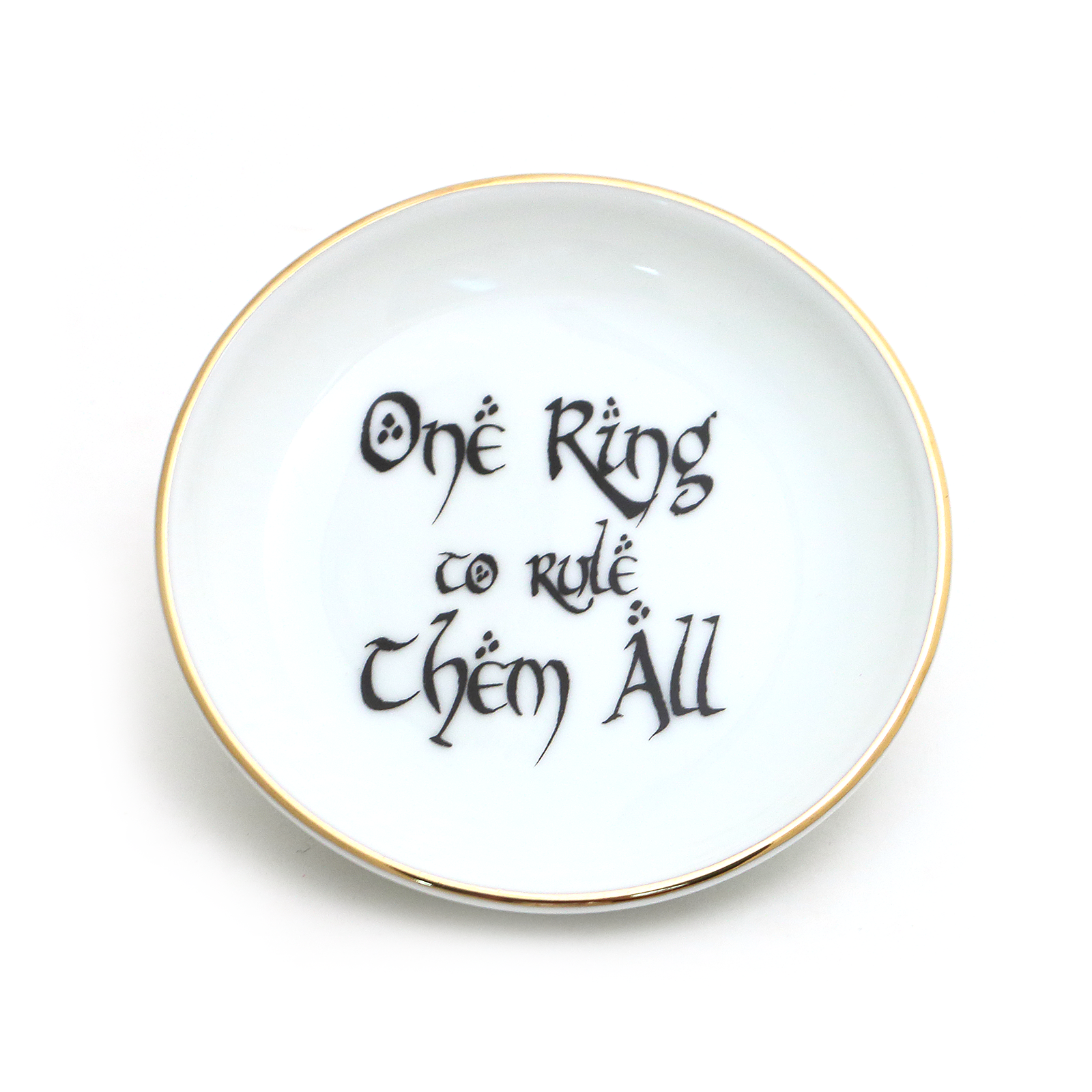 This handmade ring dish is very precioussssss. The perfect gift for Hobbit, Lord of The Rings, Tolkien fans- it reads: One Ring To Rule Them All. This small round dish is the perfect place to keep rings or other trinkets while busy working. Created from porcelain clay and kiln fired numerous times. This small dish measures 4 x 4 and features a 22K gold rim. trinket holder trinket dish Tolkein the hobbit
