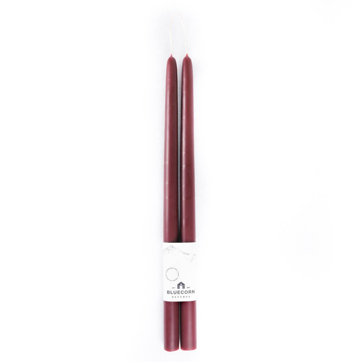 Bluecorn tapers are classic candles dipped into pure molten beeswax at just the right temperature by a steady hand and a keen eye. They are dipped and cooled over twenty times each before a pair can be cut free from the oak rack. When finished and hung, they carry the rich scent of honey and seem to hold light in their bellies. Kept out of drafts and away from fans these tapers will burn virtually dripless for about one hour per inch of length. We recommend stocking up on all the lengths in raw to start, or opting for a single length across a variety of colors. These joined pairs make an awesome display when hung on peg rails or similar!