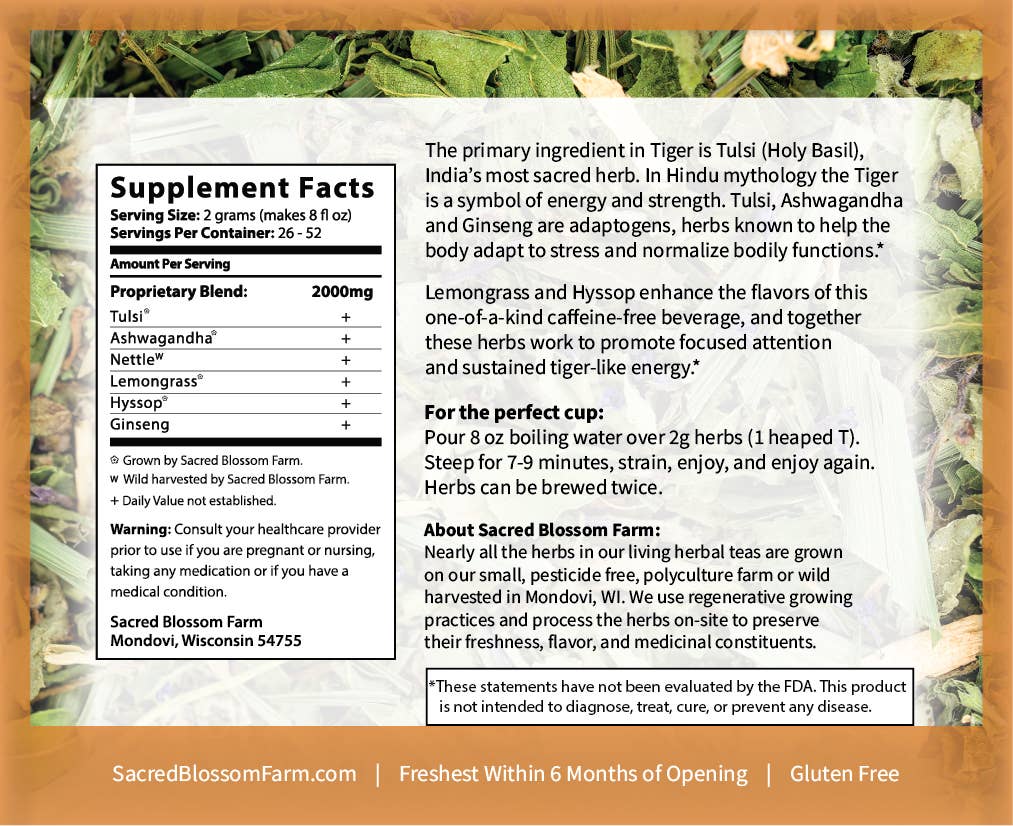 The primary ingredient in Tiger is Tulsi (Holy Basil), India’s most sacred herb. In Hindu mythology the Tiger is a symbol of energy and strength. Tulsi, Ashwagandha and Ginseng are adaptogens, herbs known to help the body adapt to stress and normalize bodily functions.*