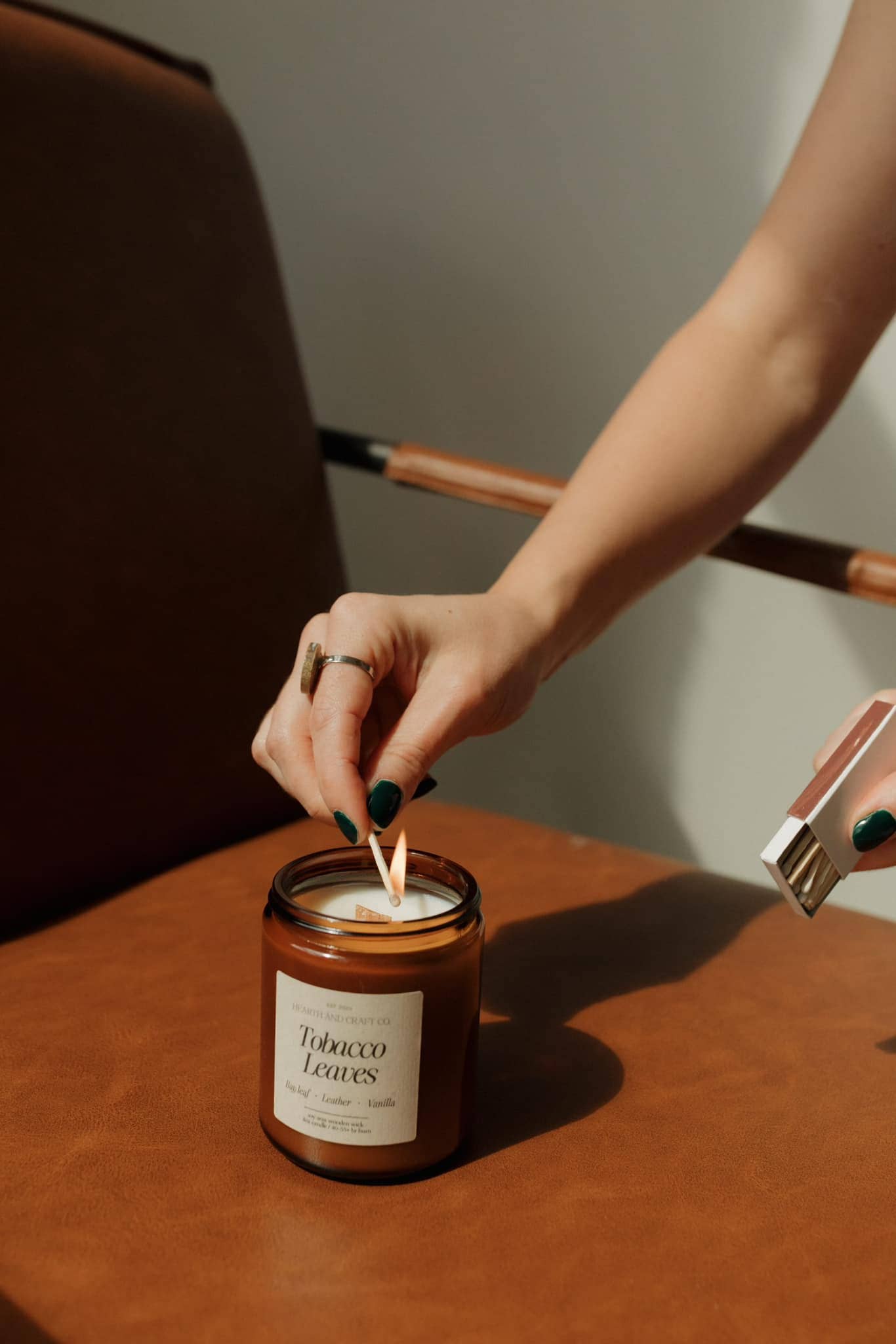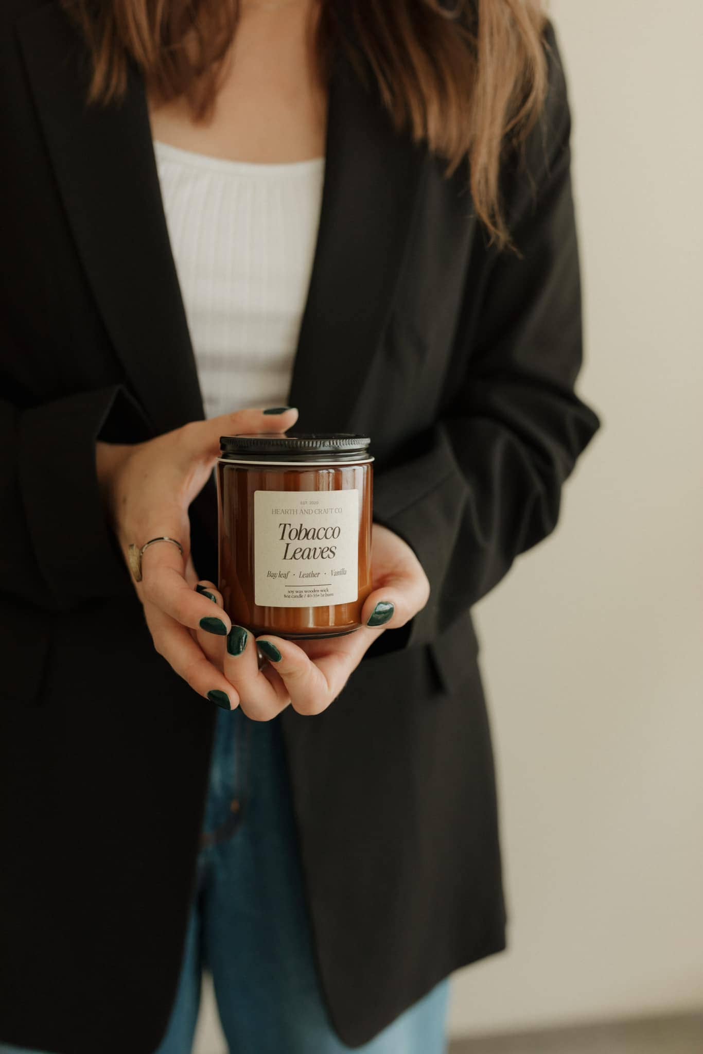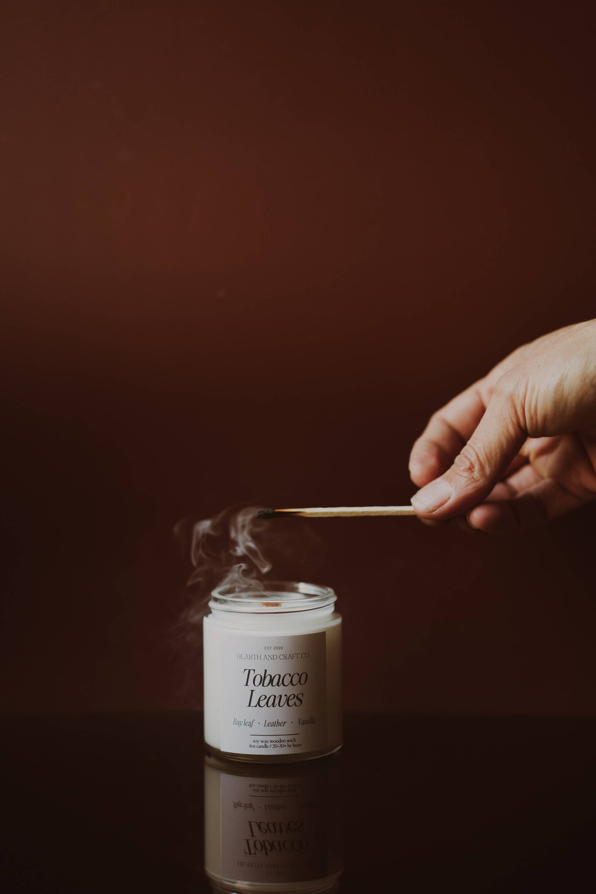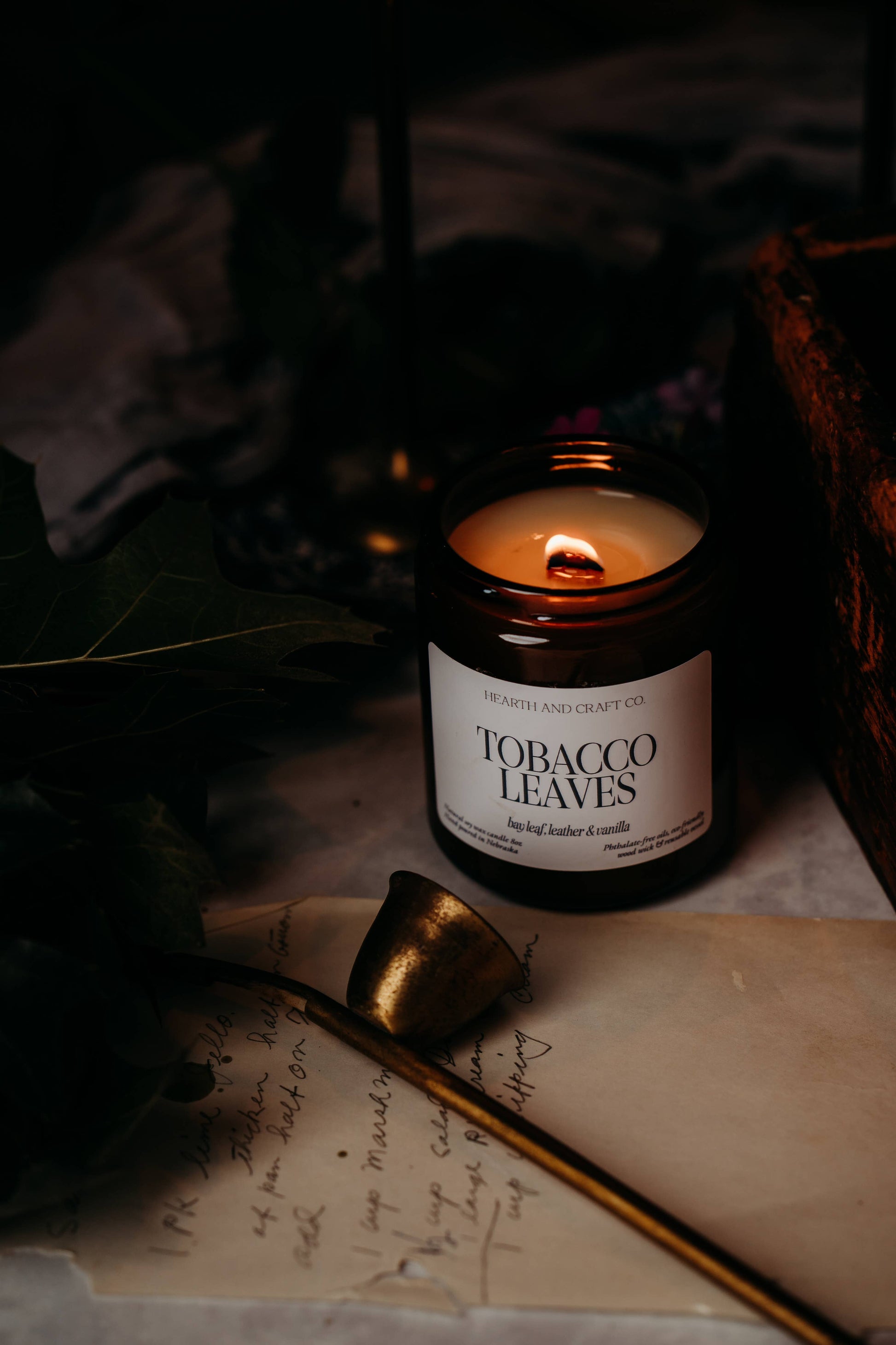 Masculine & Sultry | bay leaf, sandalwood, cedar, almond, leather, amber, musk, ginger, bay leaf, clove, cinnamon & vanilla | All natural soy wax, and non-toxic eco friendly wooden wick, phthalate free fragrances | soft crackle | Burn time: 60-70+ hours